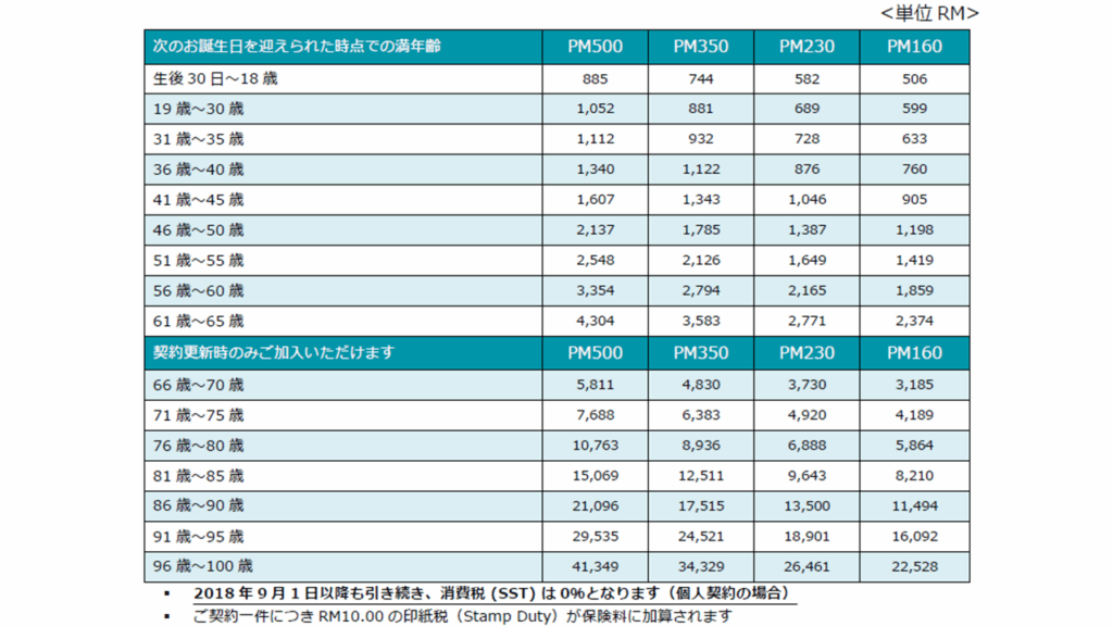 | 通算支払限度額 | RM120,000 | RM85,000 | RM60,000 | RM40,000 |