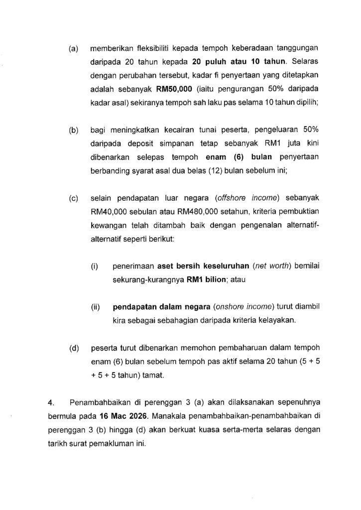 従来の20年のみから、「20年」または「10年」のいずれかを選択できる柔軟な制度といたします。これに伴い、10年の滞在許可期間を選択した場合の参加費は、従来の50%減額となるRM50,000に設定されます。
