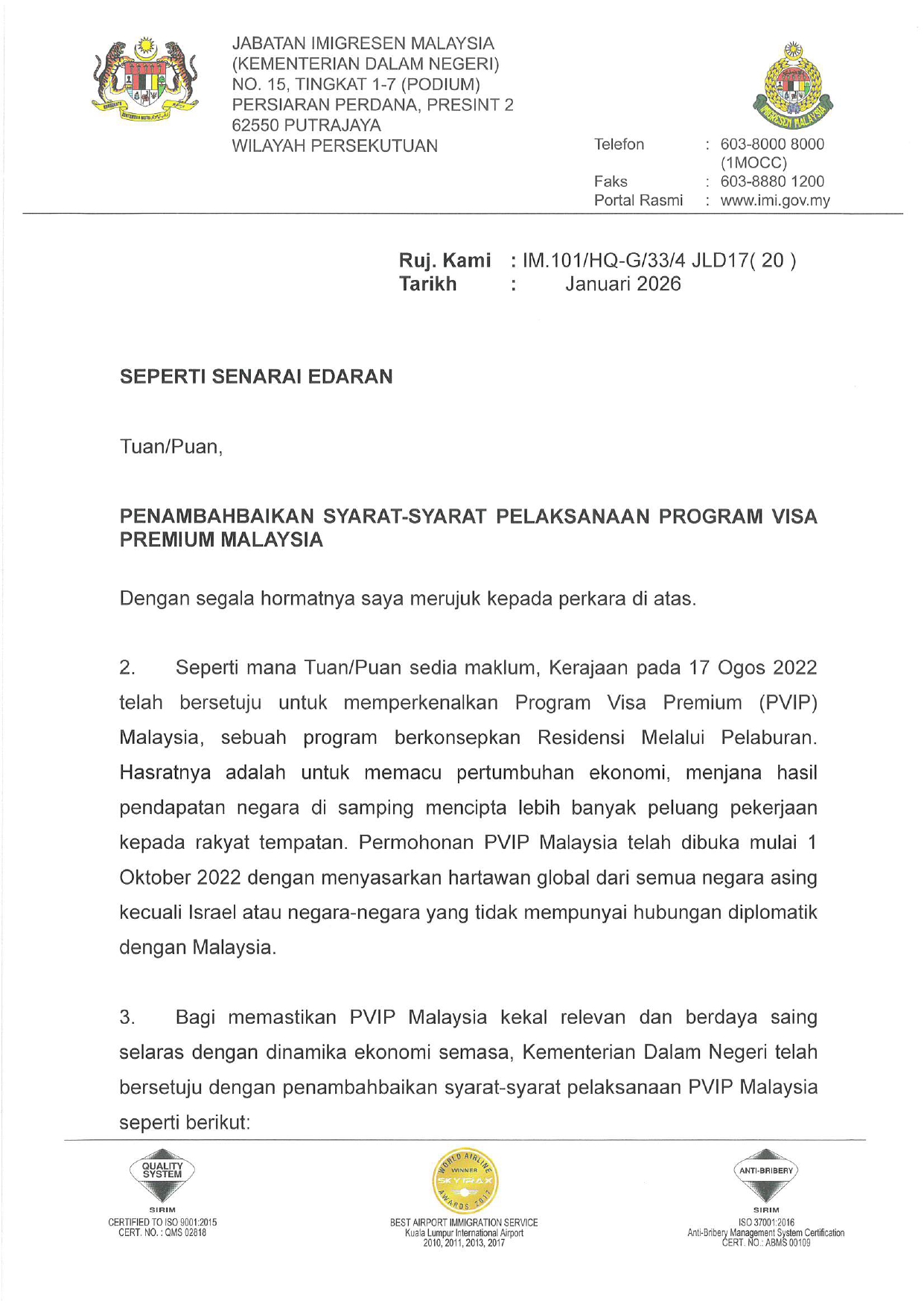 マレーシア・プレミアム・ビザ・プログラム(PVIP)の実施に関する