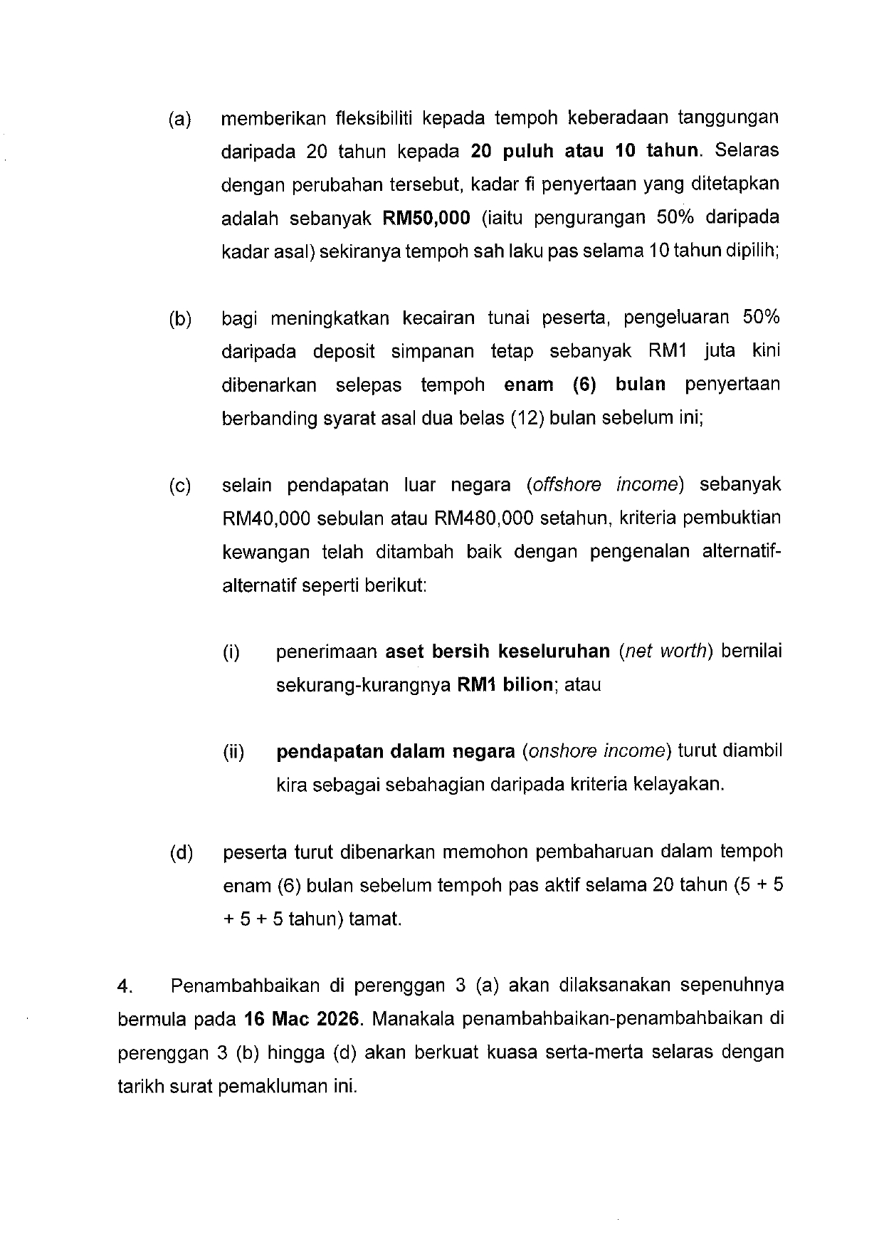 参加者の資金流動性向上のため、RM100万の定期預金のうち50%について、従来の12か月後ではなく、参加開始から6か月後に引き出しが可能となります。