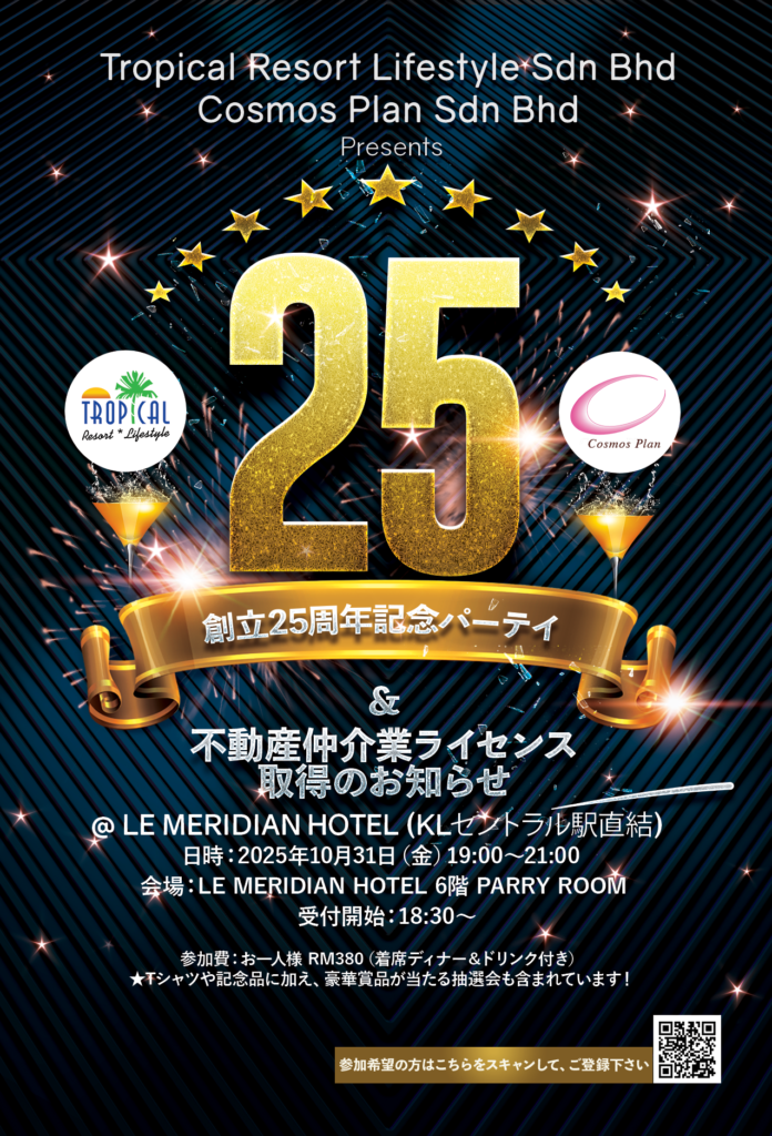 また、この節目にあたり、弊社代表・石原が日本人として初めてマレーシアにて不動産仲介業の正式ライセンスを取得し、新グループ会社「コスモスリアリティ」を立ち上げる運びとなりました。本イベントはその記念の場ともなります。